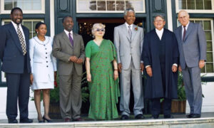સન 1996માં લેવાયેલી આ છબિ છે. દક્ષિણ આફ્રિકાના કેઇપ ટાઉન નગરમાં સંસદ ભવનના શુભારંભ ટાંકણે લેવાયેલી આ છબિમાં (ડાબેથી) સિરીલ રામફોસા, ઝાનેલે મ્બેકી, થાબો મ્બેકી, ફ્રેની જીનવાલા, નેલસન મન્ડેલા, કોબી કોયેત્સી તેમ જ એફ.ડબલ્યુ. દ’ ક્લર્ક દૃશ્યમાન છે.