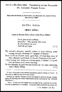 આ કૃતિ અંગે બીજી એક વાત પણ નોંધવી જોઈએ. ફાર્બસે કરેલો તેનો અંગ્રેજી અનુવાદ પહેલાં પ્રગટ થયો, મૂળ કૃતિ (જેટલી ઉપલબ્ધ હતી તેટલી) તો છેક ૧૯૦૩માં છપાઈ હતી. રેવાશંકર અંબારામ ભટ્ટે તે છપાવીને પ્રગટ કરી હતી. જો કે પુસ્તકના ટાઈટલ પેજ પર તેમણે આ કૃતિ દલપતરામે લખી હોવાનો ભ્રમ ઊભો થાય તે રીતે તેમનું નામ મૂક્યું છે : “આ ગ્રંથ એલેક્ઝાન્ડર કીન્લાક ફાર્બસ સાહેબે મેળવેલો અને કવીશ્વર દલપતરામ ડાહ્યાભાઈએ લખેલો.’ આપણે અગાઉ જોયું તેમ દલપતરામ રત્નમાળના કર્તા નથી, અનુવાદક છે. છપાયેલા પુસ્તકમાં દલપતરામે એકઠી કરેલી બીજી કેટલીક સામગ્રી પણ રેવાશંકરે સમાવી લીધી છે.