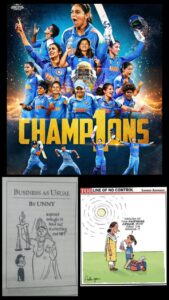 ‘ધ ઇન્ડિયન એક્સ્પ્રેસ’ વર્તમાનપત્રે ખેલાડીઓના નખચિત્રોનું એક આખું પાનું કર્યું છે જે ‘ટાઇમ્સ’ના એવાં પાનાં કરતાં વધુ રસપ્રદ જણાયું છે. ‘એક્સપ્રેસે’ મથાળું કર્યું છે : Her grit, Her game, Her glory : From Harmanpreet Kaur to Shafali Verma, meet India’s 16 pioneering World Cup winners. આ પાનાંના લેખકો છે વિનાયક મોહનરંગન અને શંકર નારાયણ. આ લેખમાં ક્રમ અને પેટામથાળાં પણ ‘એક્સ્પ્રેસ’નાં રાખ્યાં છે :